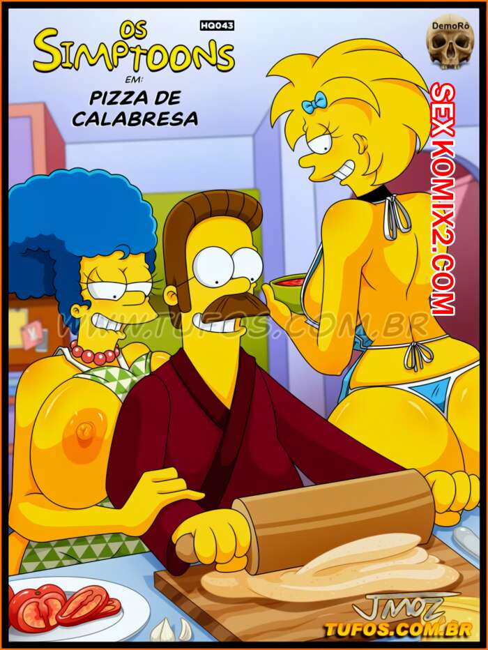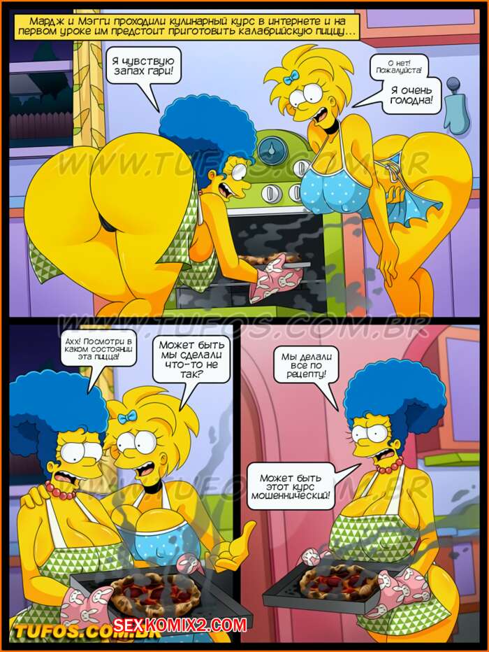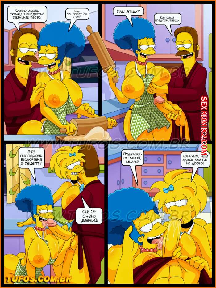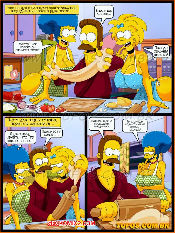 Порно комикс Симпсоны. Часть 43. Калабрийская пицца. Tufos Мардж и Мэгги решили приготовить пиццу, но у них все сгорело, так что Фландерс вызвался им помочь. У него встал хуй и красотки решили отсосать у него и дать ему себя выебать.