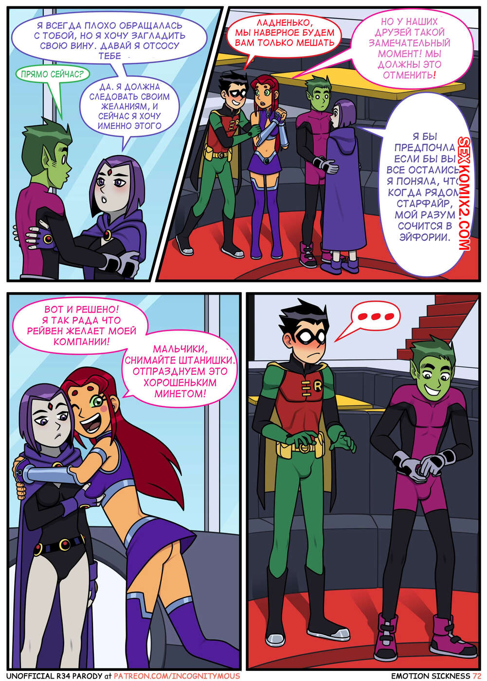 Порно комикс Титаны. Эмоциональная слабость. Часть 2. Emotion sickness. Teen titans. Incognitymous Горячие сисястые красотки Титаны продолжают испытывать огромное возбуждение. Они соблазняют своего дружка и отсасывают у него, после чего дают ему себя хорошенько выебать.