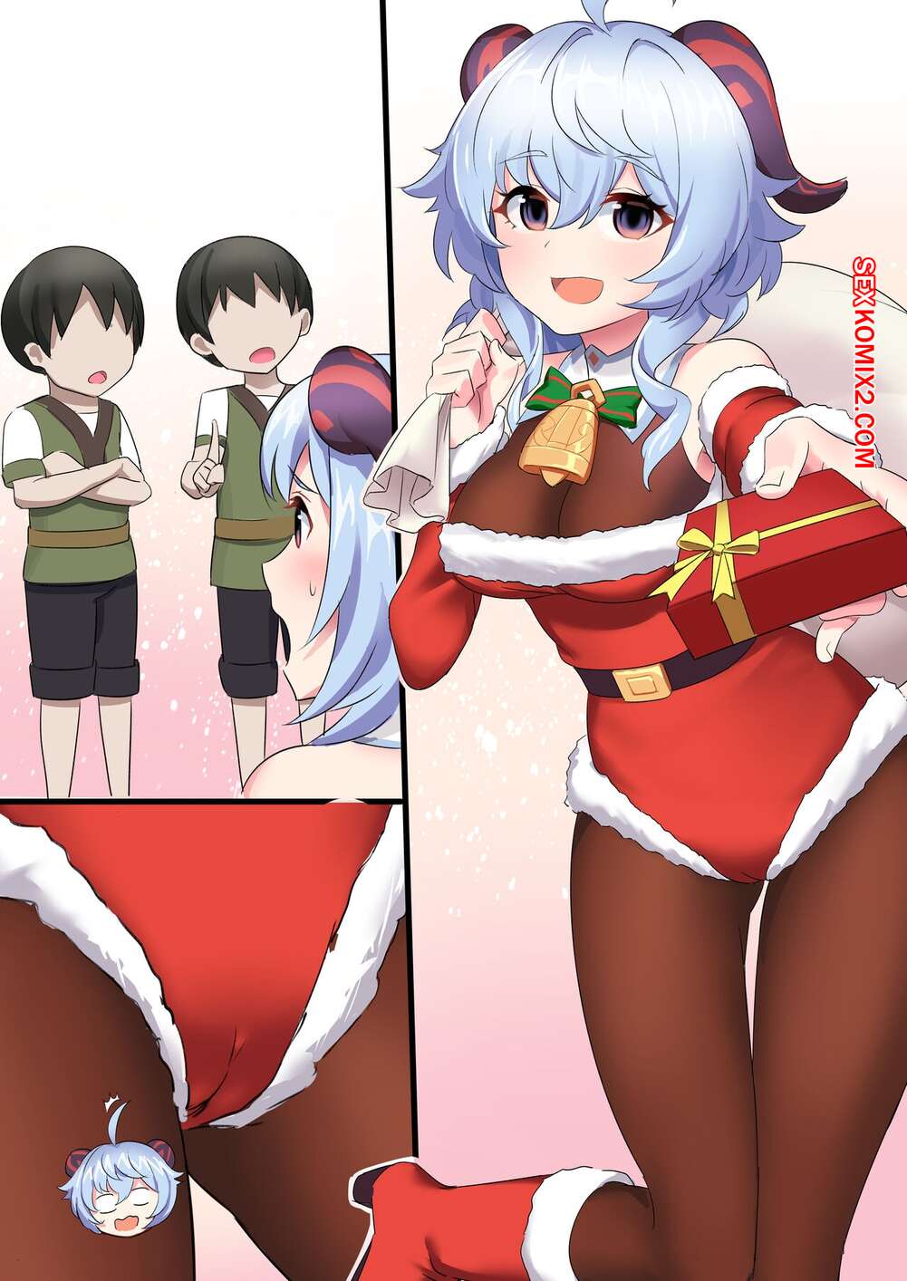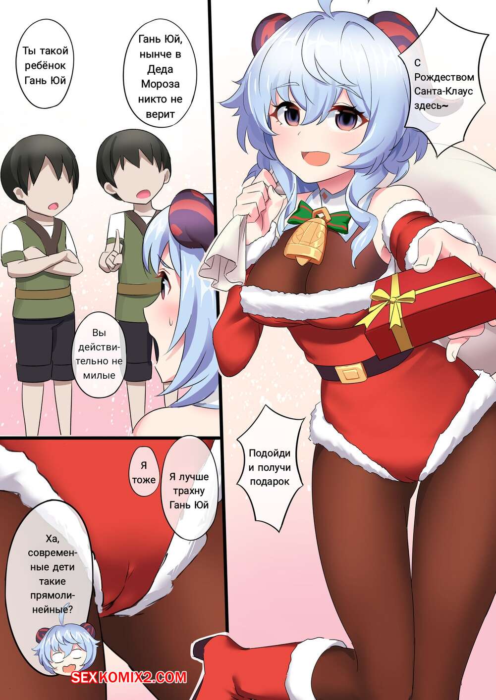 Порно комикс Genshin Impact. Гань Юй Горячая сисястая блондинка решила сделать подарок на Рождество двум молодым парням. Она разделась перед ними и дала им поласкать свои большие сиськи, после чего решила потрахаться с ними.