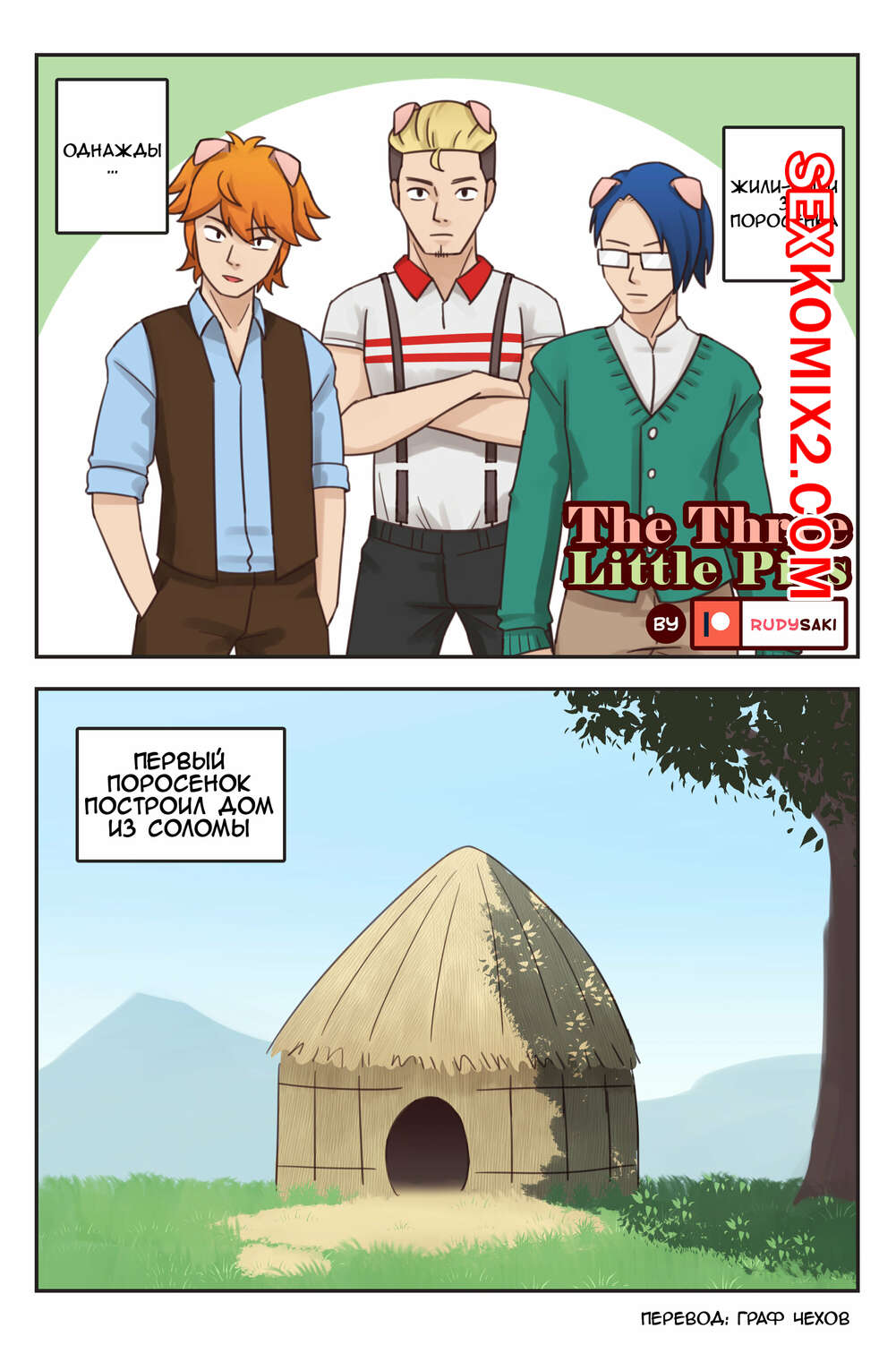 Порно комикс Три поросенка. The Three little pigs Волк напал на дома боатьев, превращая их в сексуальных девушек. После нападения на третьего брата, он сам превратился в девушку. Тем две сестры и брат решили отомстить красотке волку и выебали ее.