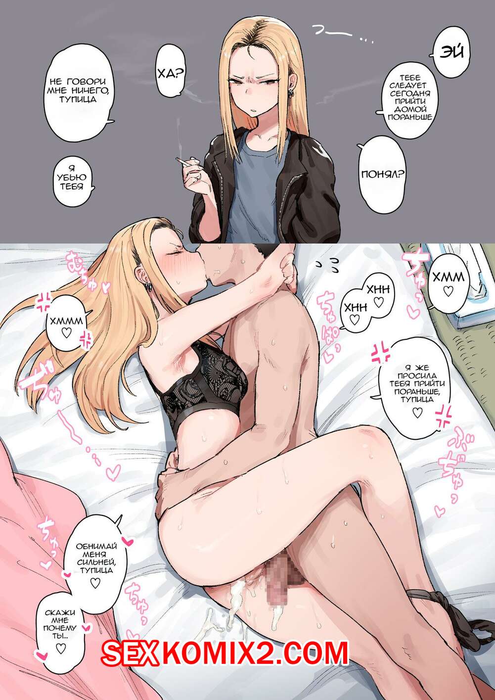 Порно комикс Моральное преследование жены преступницы. Motoyan MoraHara Tsuma Горячая сисястая блондинка была очень возбуждена и решила повеселиться со своим дружком. Она разделась перед ним и стала сосать его большой хуй, после чего дала ему себя выебать и кончить в нее.