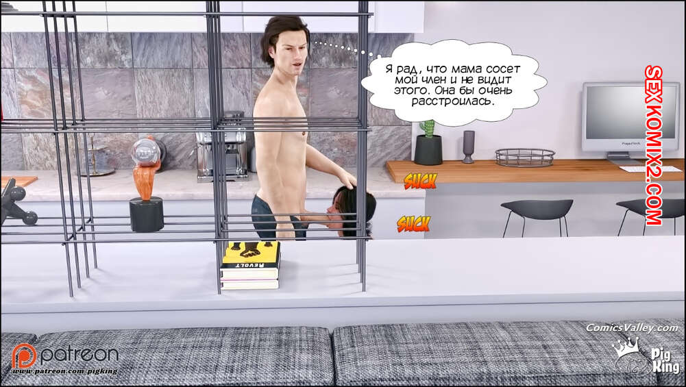 Порно комикс Адская деревня. Микаэла. Часть 5. Hell village. Micaela. Pig King Парень продолжает развлекаться со своей горячей мамкой милфой. Они уединились на кухне и сучка стала сосать хуй сына, после чего дала ему себя выебать. Тем временем, сестра парня стала соблазнять отца.
