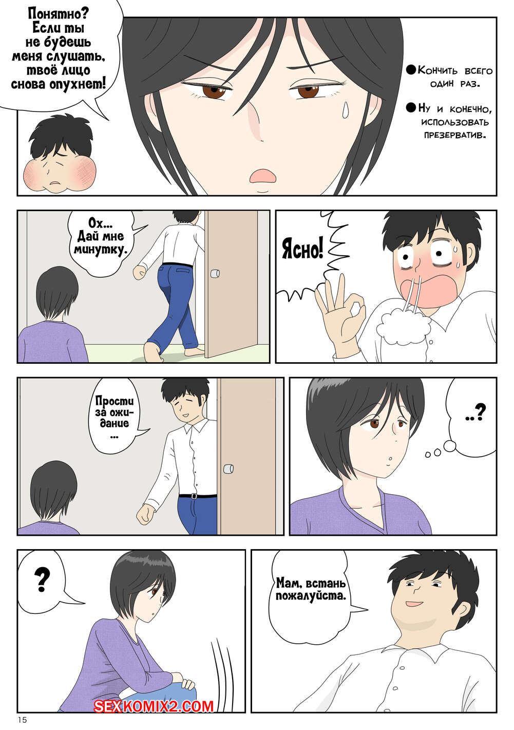Порно комикс Моя мама мастурбатор. Часть 3. Onaneta Kaasan. Mizuarai No Kai Сисястая милфа брюнетка продолжает веселиться со своим сыном. Она частенько уединяется с ним и сосет большой хуй сына, после чего дает ему себя трахать, получая огромное удовольствие.