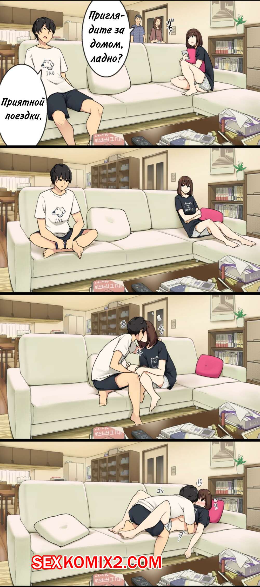 Порно комикс Когда родители уходят, мы трахаемся на диване в гостиной. Полная версия Брат с сестрой дожидаются когда их родители уйдут из дома, чтобы затем повеселиться. Девушка раздевается и сосет большой хуй брата, после чего дает ему себя хорошенько выебать.