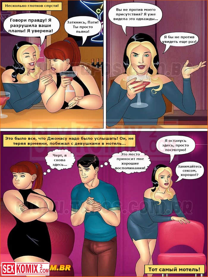 Порно комикс Тетя, кузины и племянник. Часть 12. После отличной вечеринки парень пришёл домой с двумя симпатичными девушками, они предложили секс втроем и он согласился.