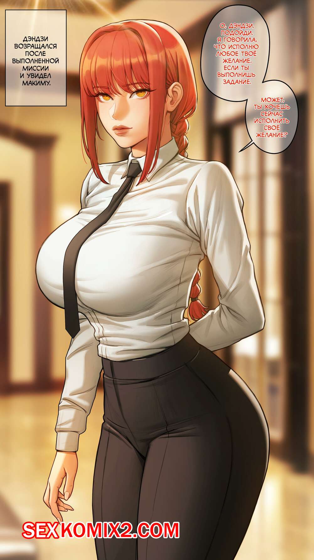 Порно комикс Chainsaw Man. Макима. Roborobocap Парень был очень возбужден и попросил свою рыжую подругу помочь ему расслабиться. Красотка сняла блузку и стала дрочить большой хуй парня своими сиськами, помогая ему кончить.
