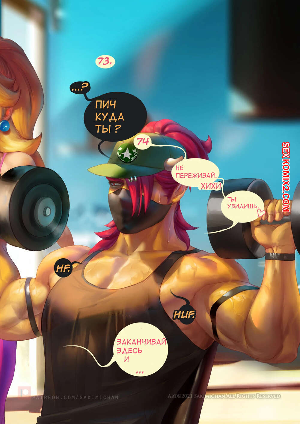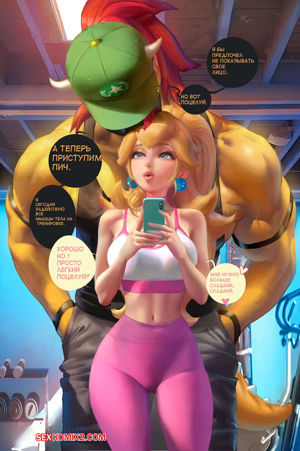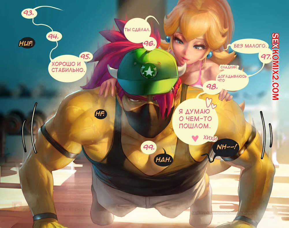 Порно комикс Марио. Тренировочный день Пич. Princess Peach Gym Days. Sakimichan. Сексуальная блондинка Пич тренировалась в спортивном зале и решила повеселиться со своим дружком. Она разделась и отсосала его большой хуй, после чего дала ему себя выебать.