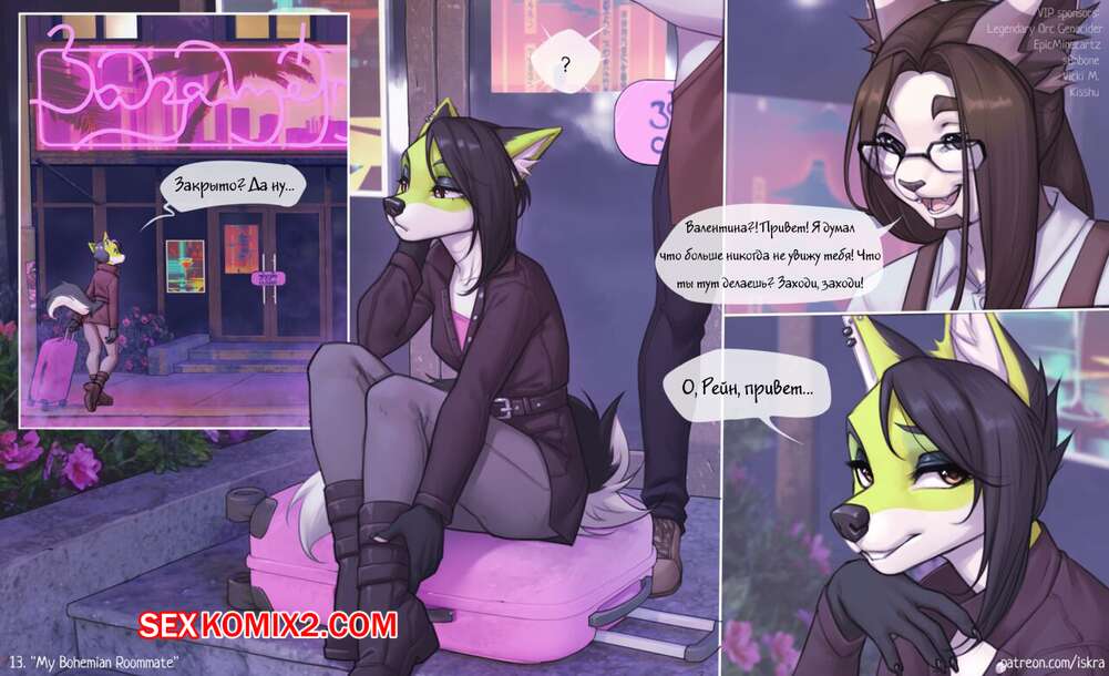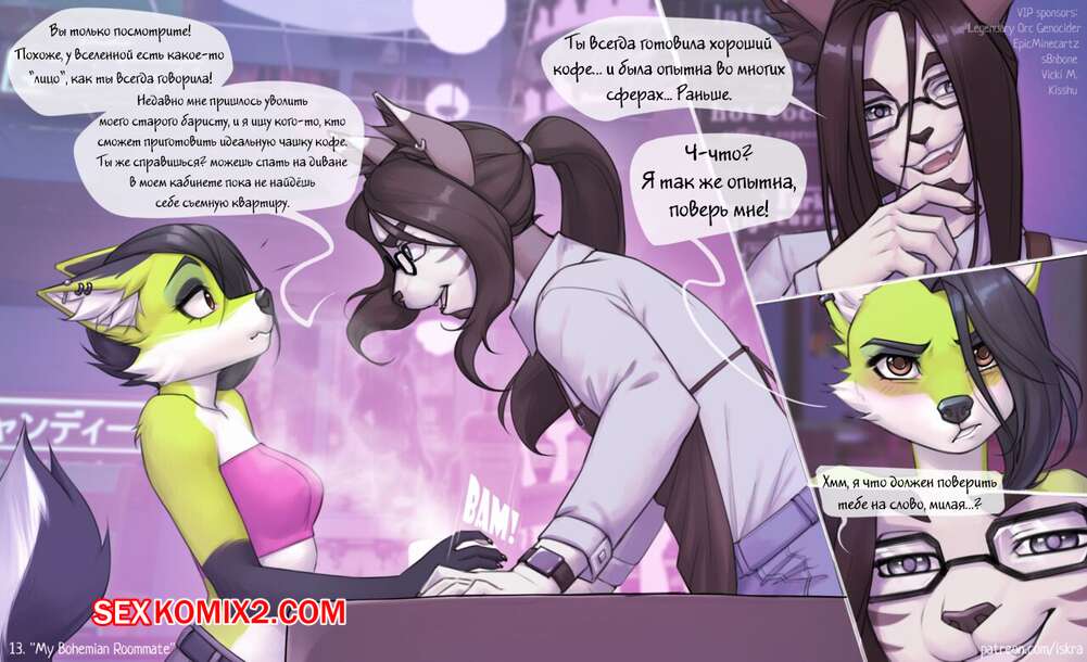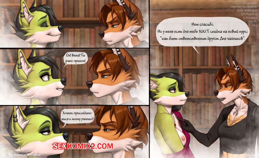 Порно комикс My Bohemian Roommate. Iskra Сексуальная брюнетка фурри просто без ума от большого члена своего дружка. Она раздевается перед ним и хорошенько отсасывает, после чего дает ему выебать себя в пизду и задницу.