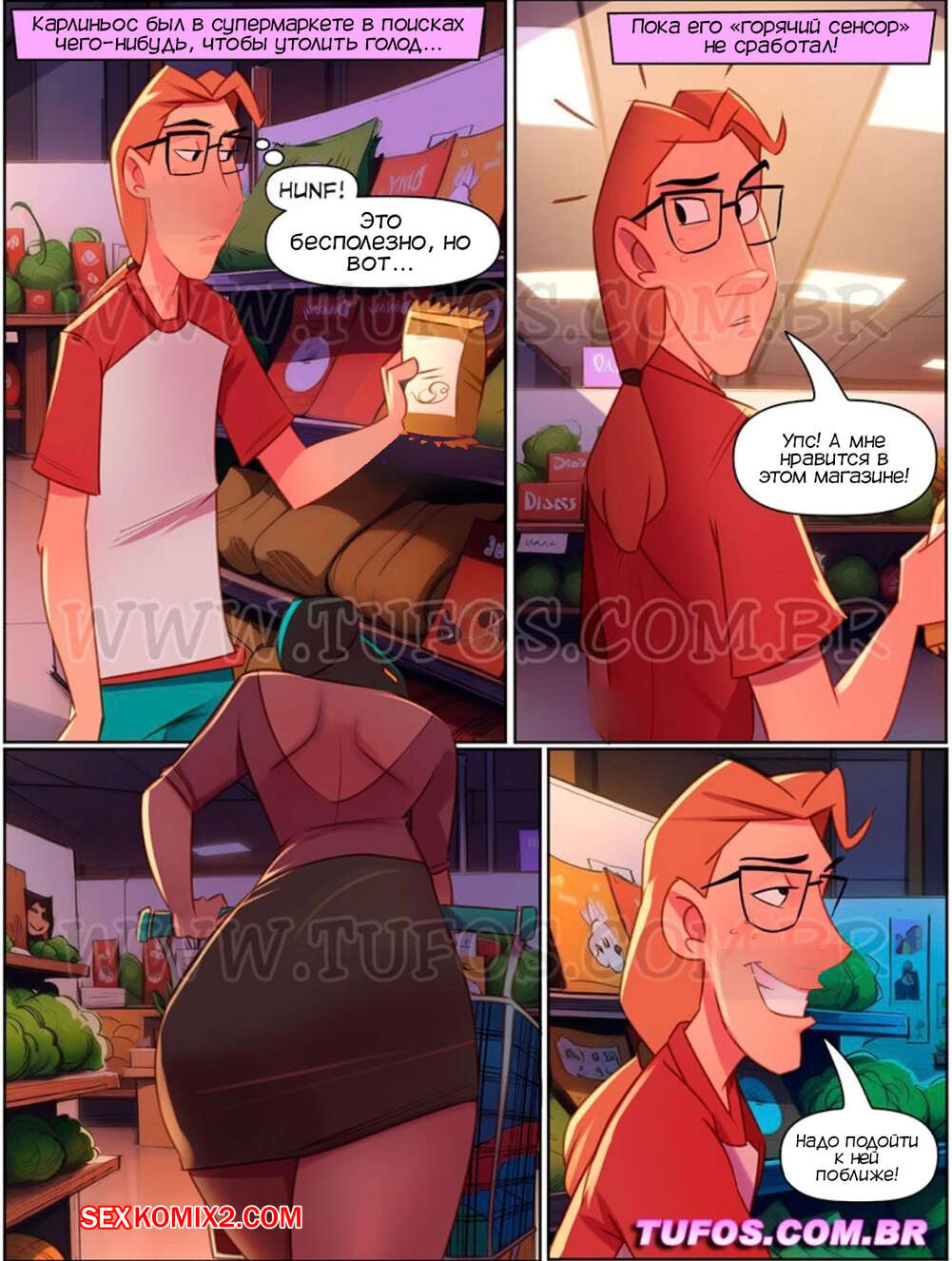 Порно комикс Четверо похотливых. Часть 13. As 4 sacanas. Tufos Карлиньос встретил в магазине Клеусу и они отправились к нему домой. Девушка была шокирована беспорядком и стала убираться, а парень возбудился и решил выебать девушку.