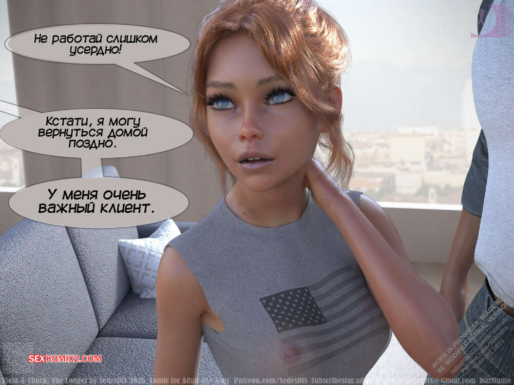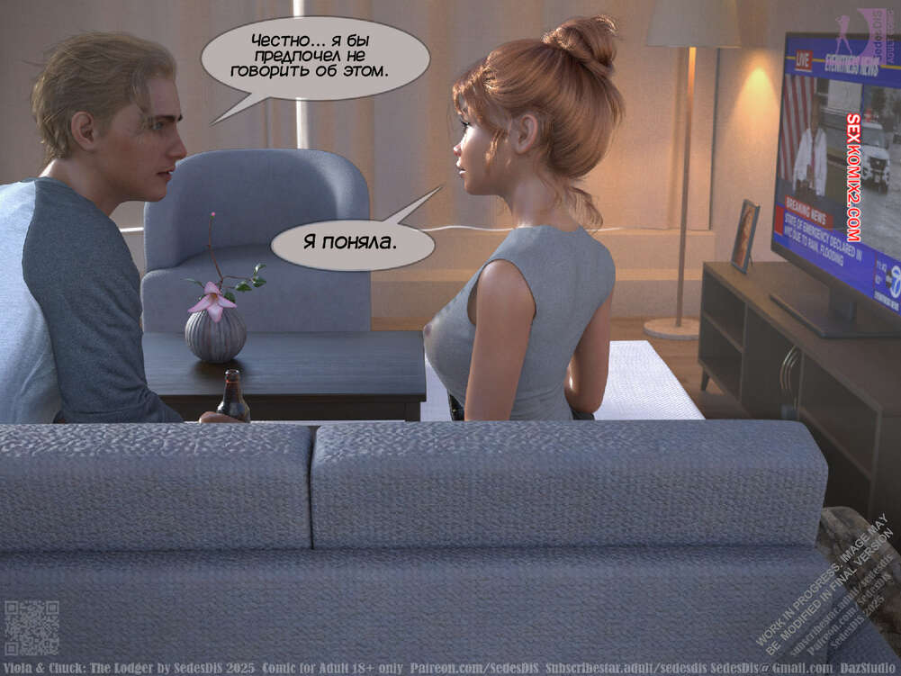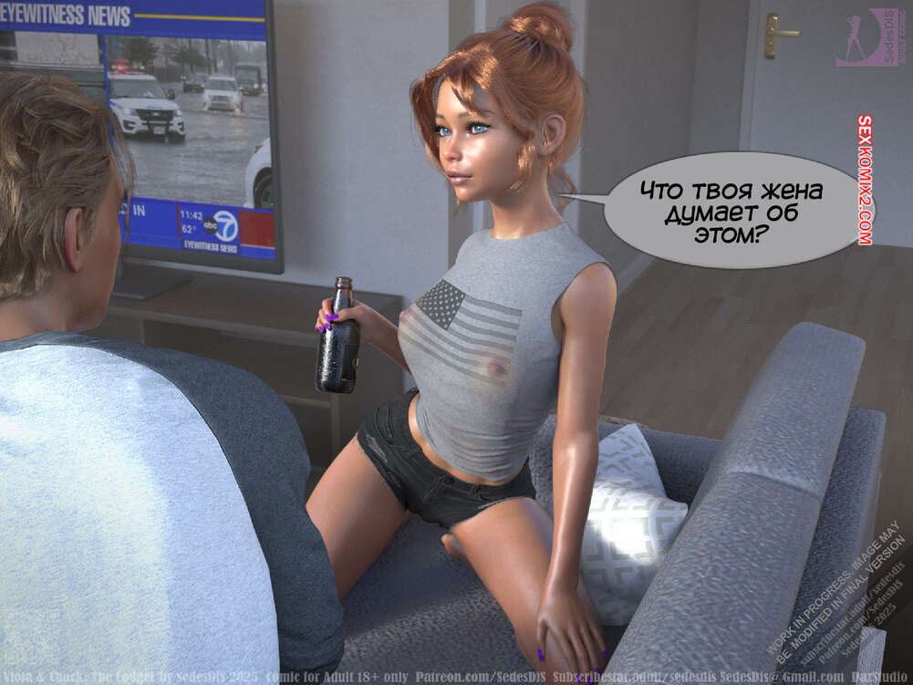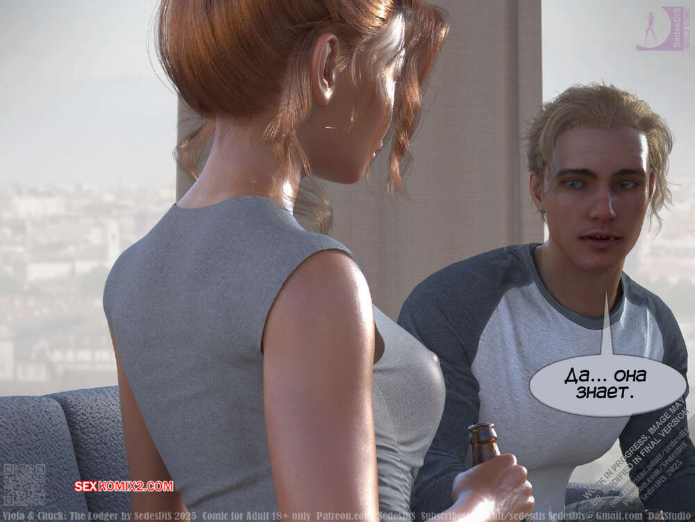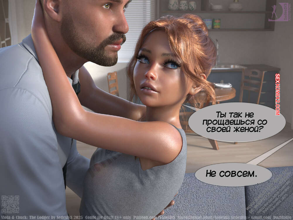 Порно комикс Виола и Чак. Жилец. Viola and Chuck. The Lodger. SedesDiS Виола живет со своим мужем и к ним на несколько дней приехал старый приятель Чака, Мартин. Мужчина познакомил любимую с другом, после чего оставил их наедине и поехал на работу.