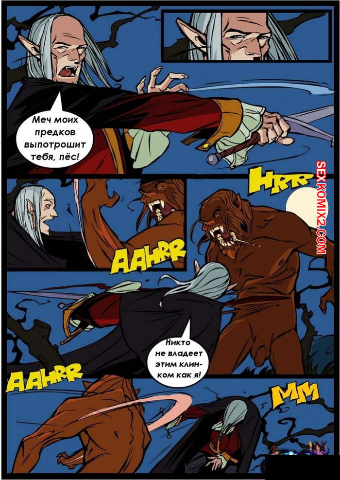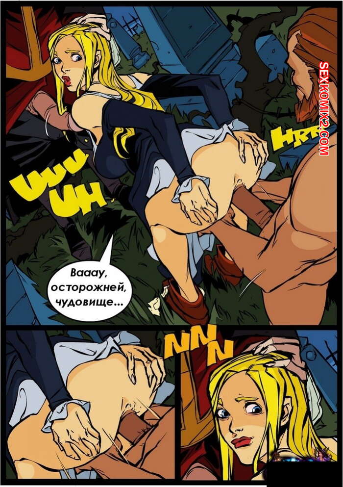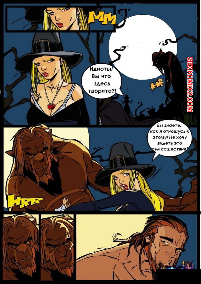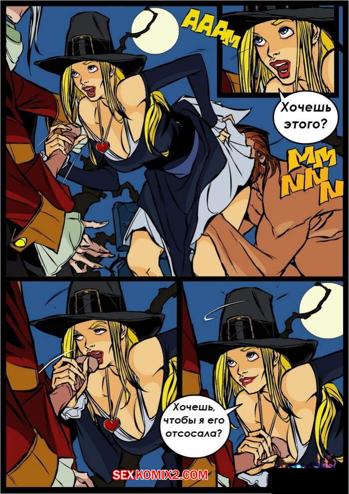 Порно комикс Ведьма. Witch. Часть 5 Красивая ведьма блондинка прервала бой между оборотнем и старым охотником на монстров. Тогда они перевели все внимание на красотку, стали ласкать ее сиськи и киску, а затем достали свои хуи, чтобы выебать ее в рот и пизду.