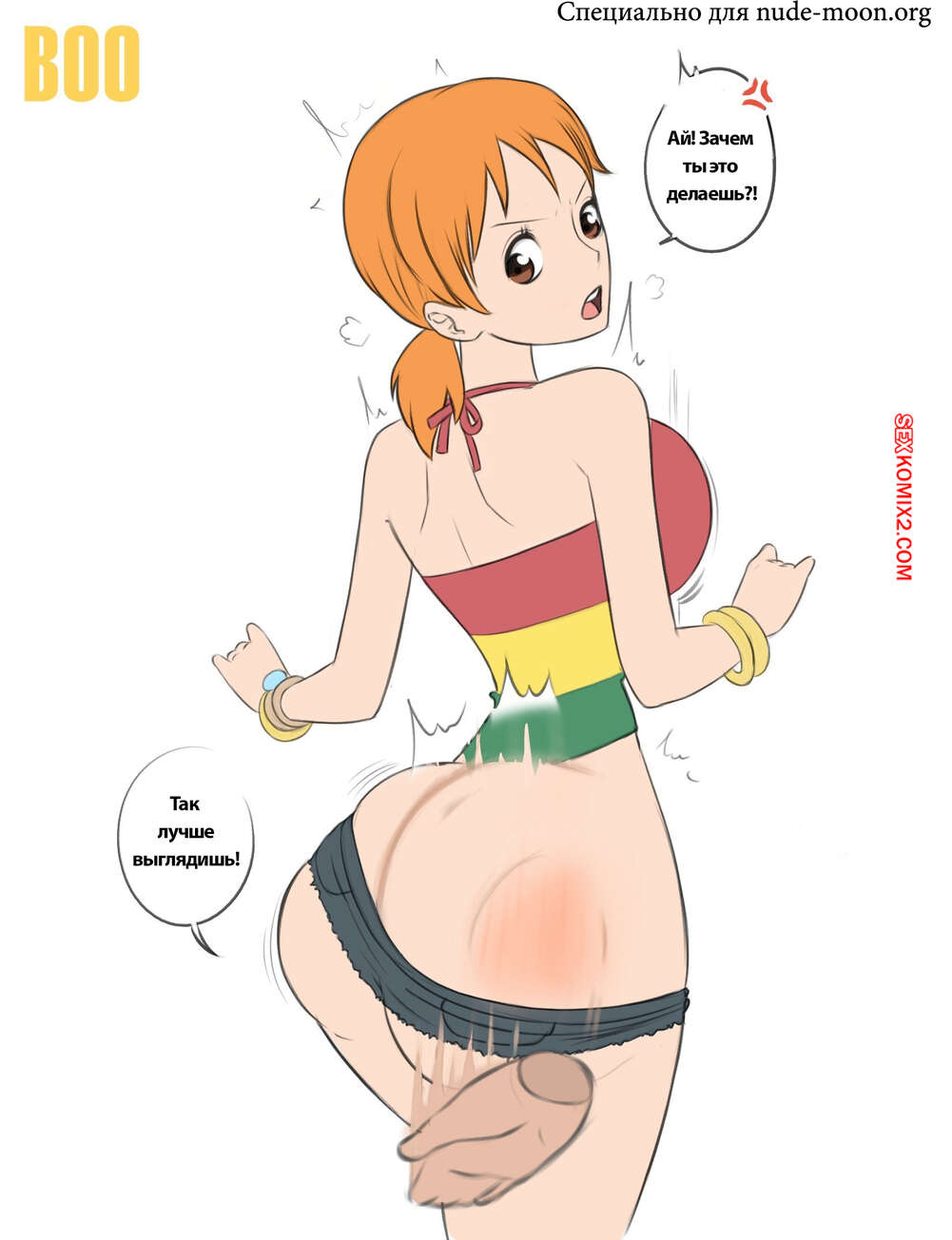 Порно комикс One Piece. Задница Нами. Namis Ass. Biggies00 Красотка Нами ходит перед парнем в откровенном наряде, вызывая у него стояк. Он лапает попку девушки, после чего снимает с нее шортики и хорошенько ее трахает.