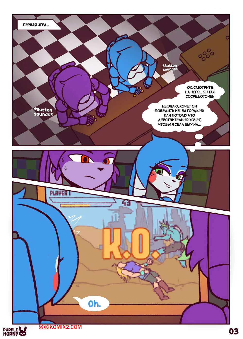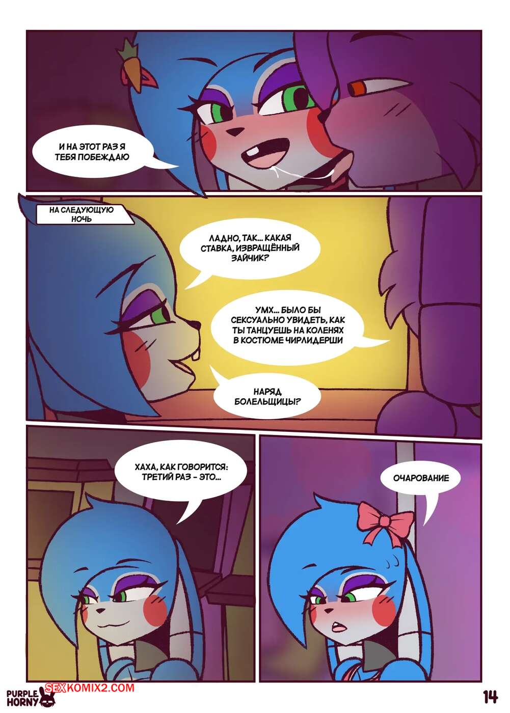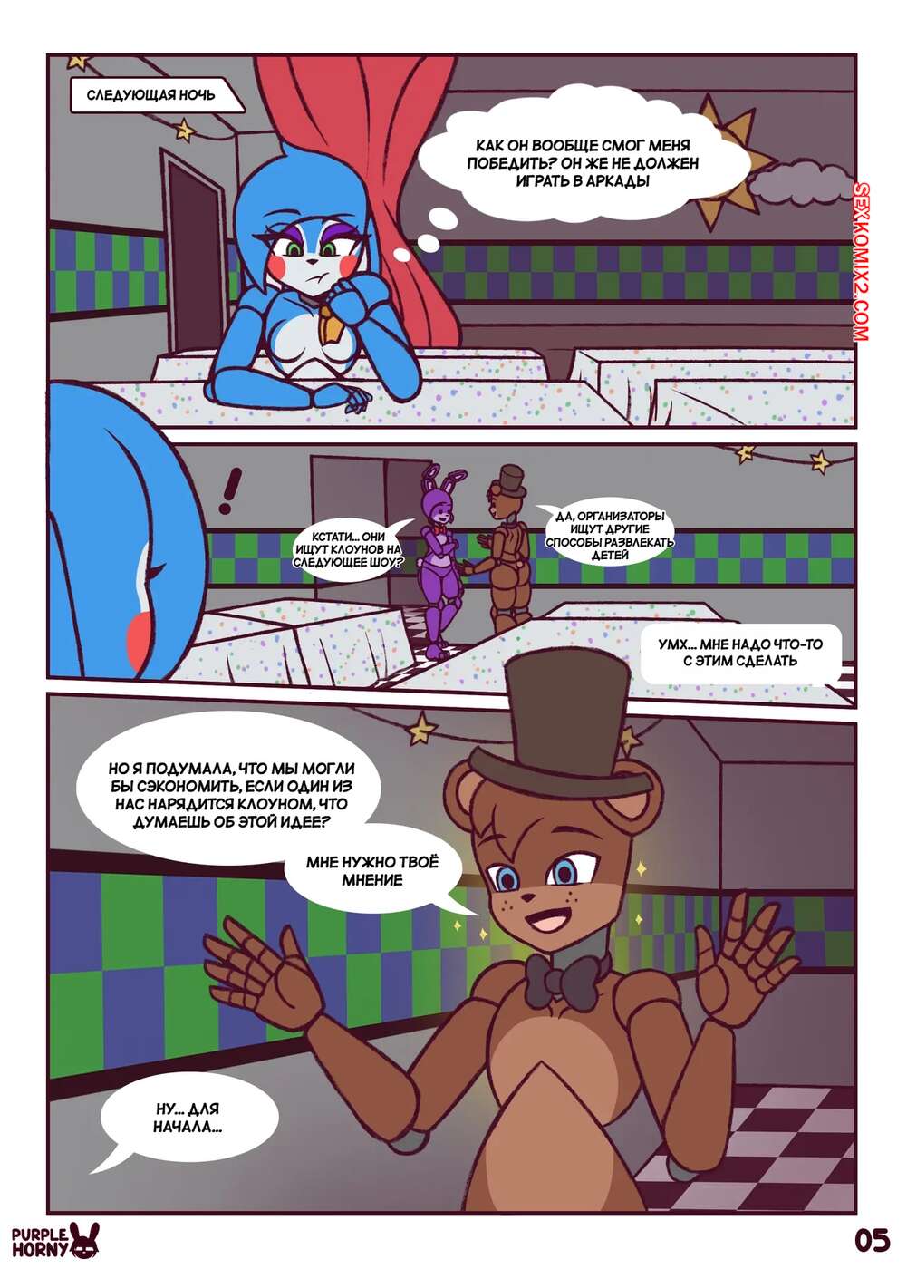 Порно комикс Five Nights at Freddys. Пари. The Bet. PurpleHorny. Возбужденная красотка отправилась в комнату к своему дружку, желая повеселиться. Девушка встала на колени и отсосала его большой член, после чего раздвинула ножки и дала себя выебать.