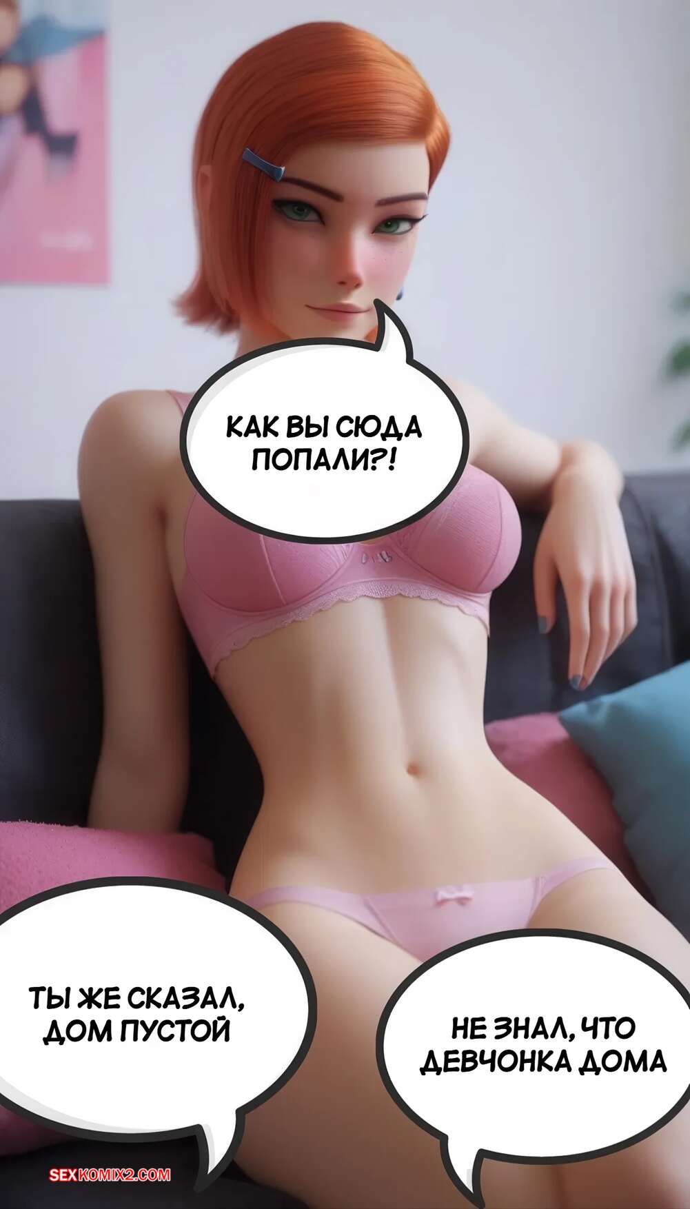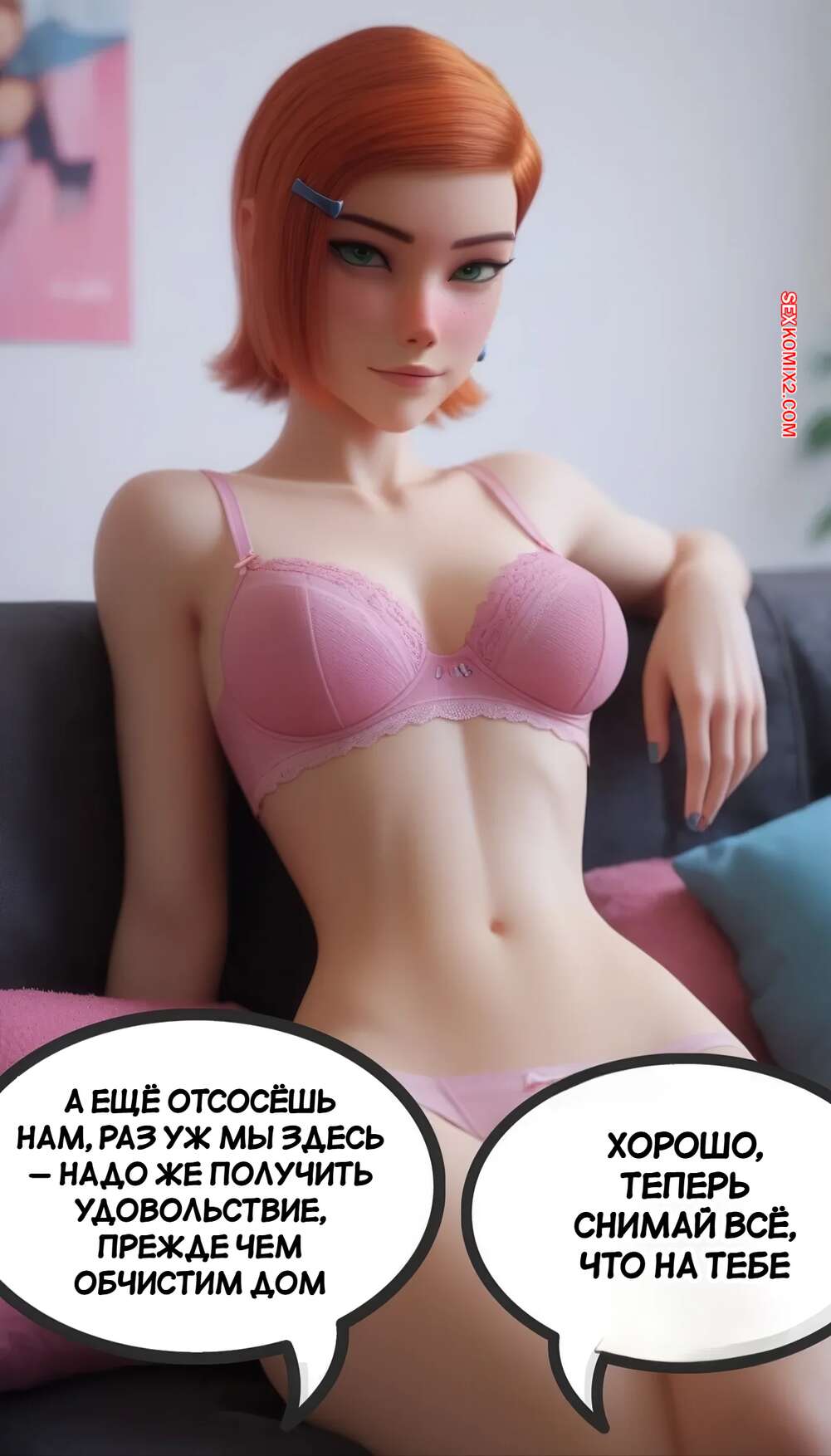 Порно комикс Бен 10. Вторжение в дом Гвен Теннисон. Gwen Tennysons Home Invasion Два грабителя пробрались в дом Гвен и девушка встретила их в сексуальном белье. Она встала на колени перед парнями и отсосала их члены, после чего дала себя хорошенько выебать.