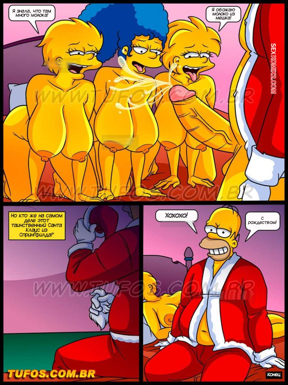 Порно комикс Симпсоны. Часть 76. Os Simptoons. Tufos В Спрингфилде канун Рождества и Гомер в образе Санты отправился по району, чтобы порадовать соседок милфочек. Он дает сучкам отсосать свой большой хуй, после чего ебет их задницы.