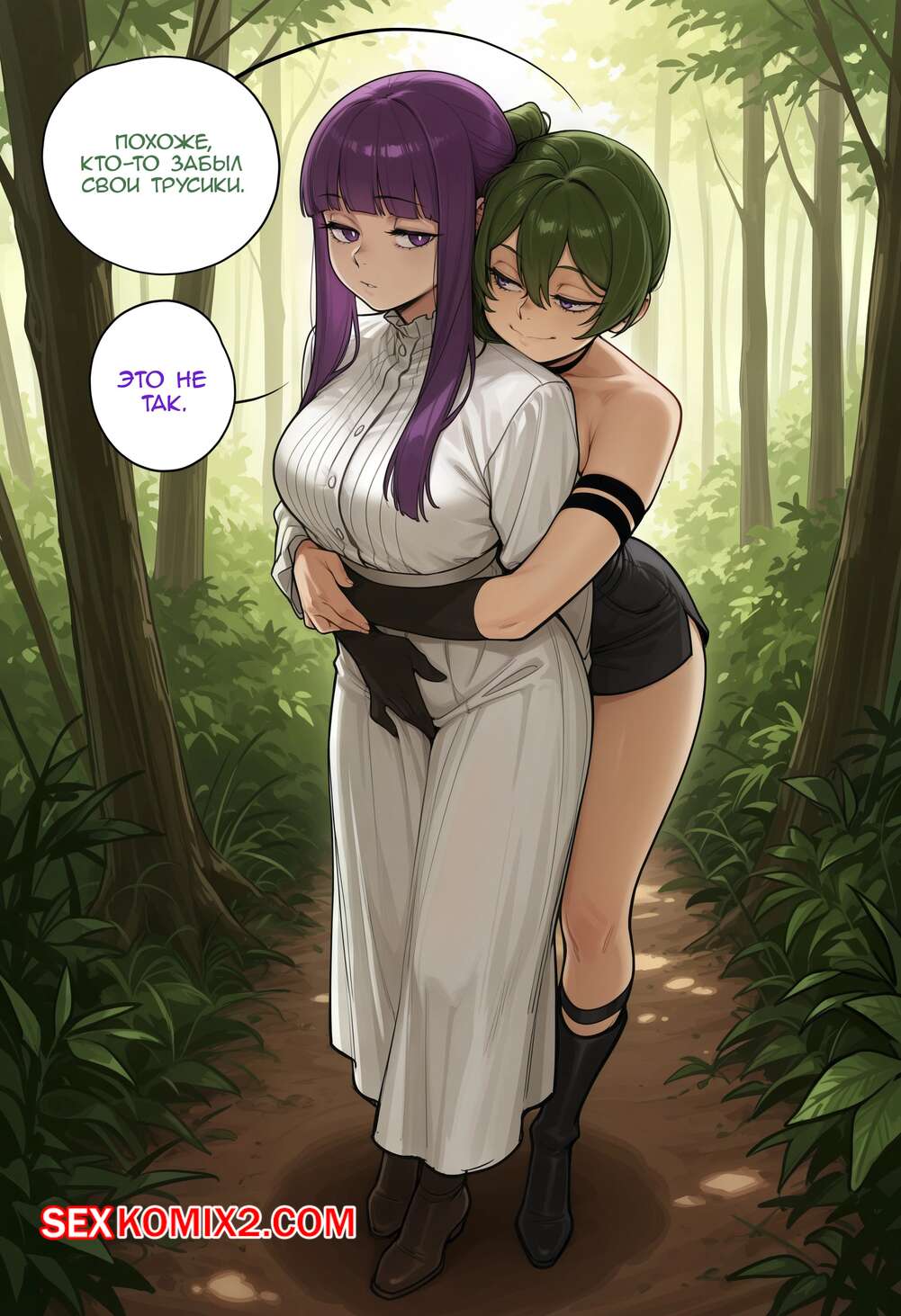 Порно комикс EnjoyerArtAI. Арты. Часть 11 Красотка обнимает Ферн сзади, желая ее возбудить и повеселиться. Брюнеточка встала раком и задрала юбку, после чего раздвинула ножки и дала подруге выебать свою пизду.