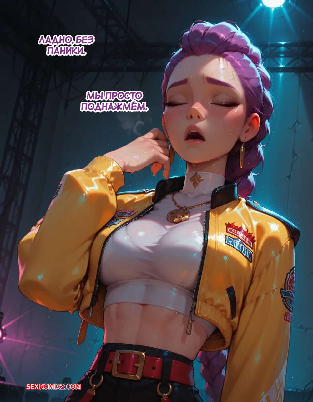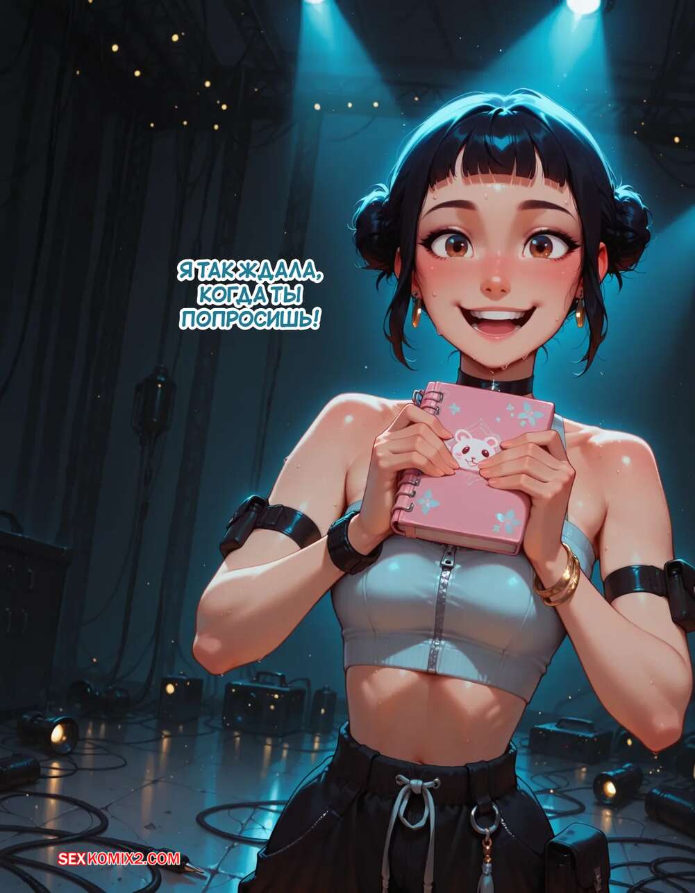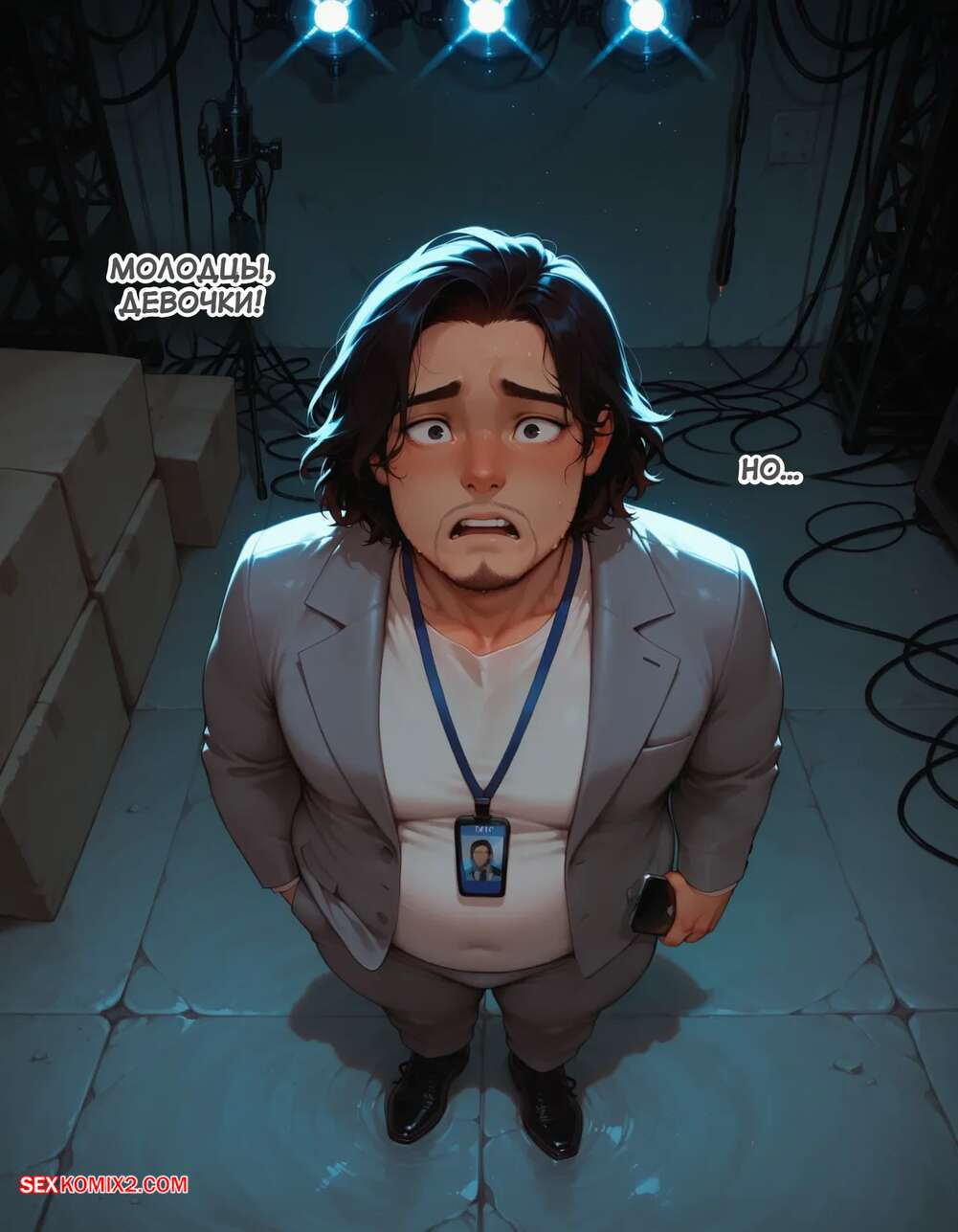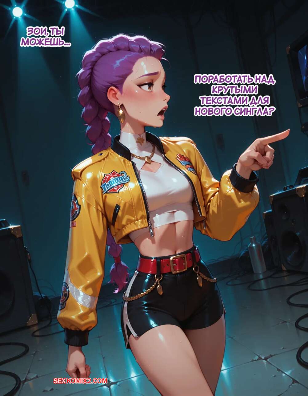 Порно комикс Течка в стриме. Heat On Stream. SAX. Горячая красотка принимает участие в прямом эфире. Она увидела у парня в штанах огромный стояк и не смогла устоять. Сучка встала на колени и взяла в ротик хуец парня, после чего дала ему кончить себе на лицо.