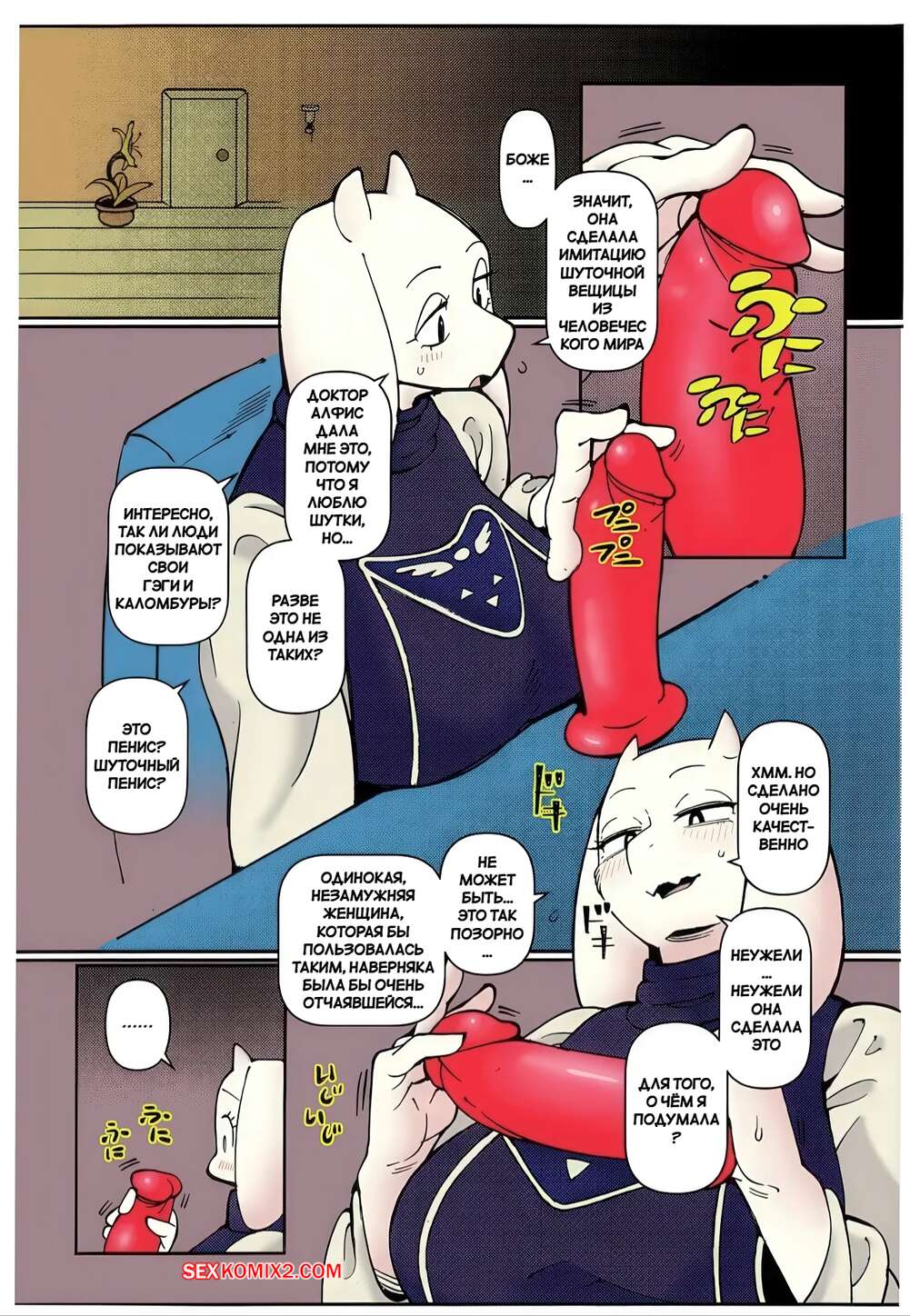 Порно комикс Undertale. Тори эро. Часть 3. TORIERO. Sindoll. Красотка Тори возбудилась и взяла дилдо, желая пошалить. Она стала трахать свою пизденку, после чего из дилдо образовался слизкий парень и выебал красотку как следует.