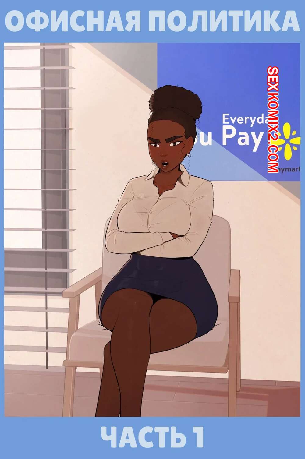 Порно комикс Офисная политика. Часть 1. Office Politics. Skemantis. Темнокожая милфа получила повышение на работе и молоденькая сотрудница решила влиться ей в доверие. Красотка залезла под стол начальницы и стала сосать ее член.
