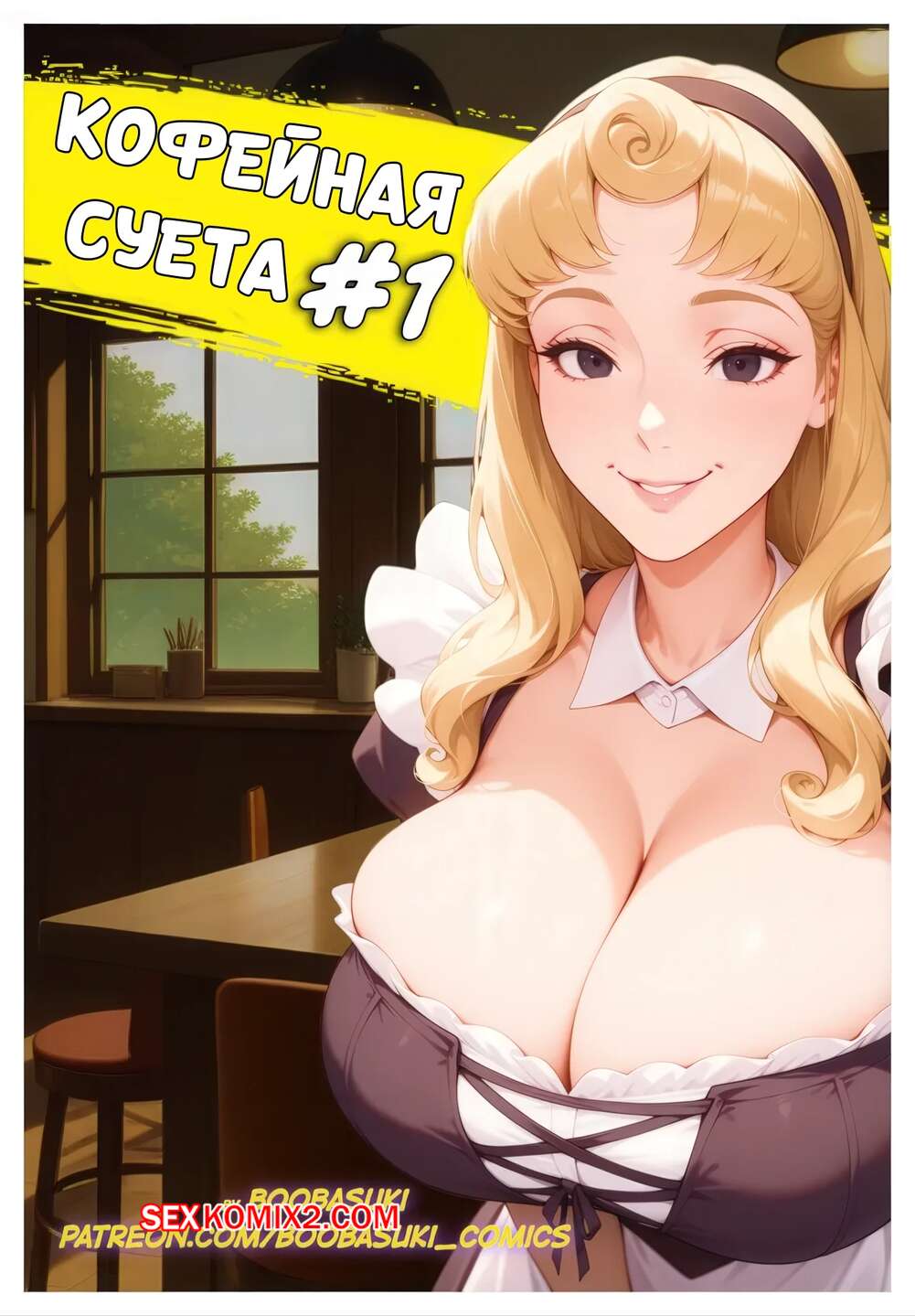 Порно комикс Кофейная суета. Coffee Bustle. Tough day. Boobasuki. Горячая блондинка с шикрным телом работает в кофейне и там большая суета. Она не справляется с заказами и в итоге ее сиськи выпадают на всеобщее обозрение, радуя клиентов.
