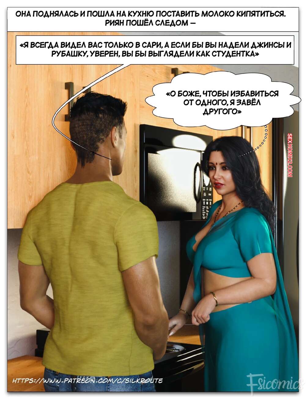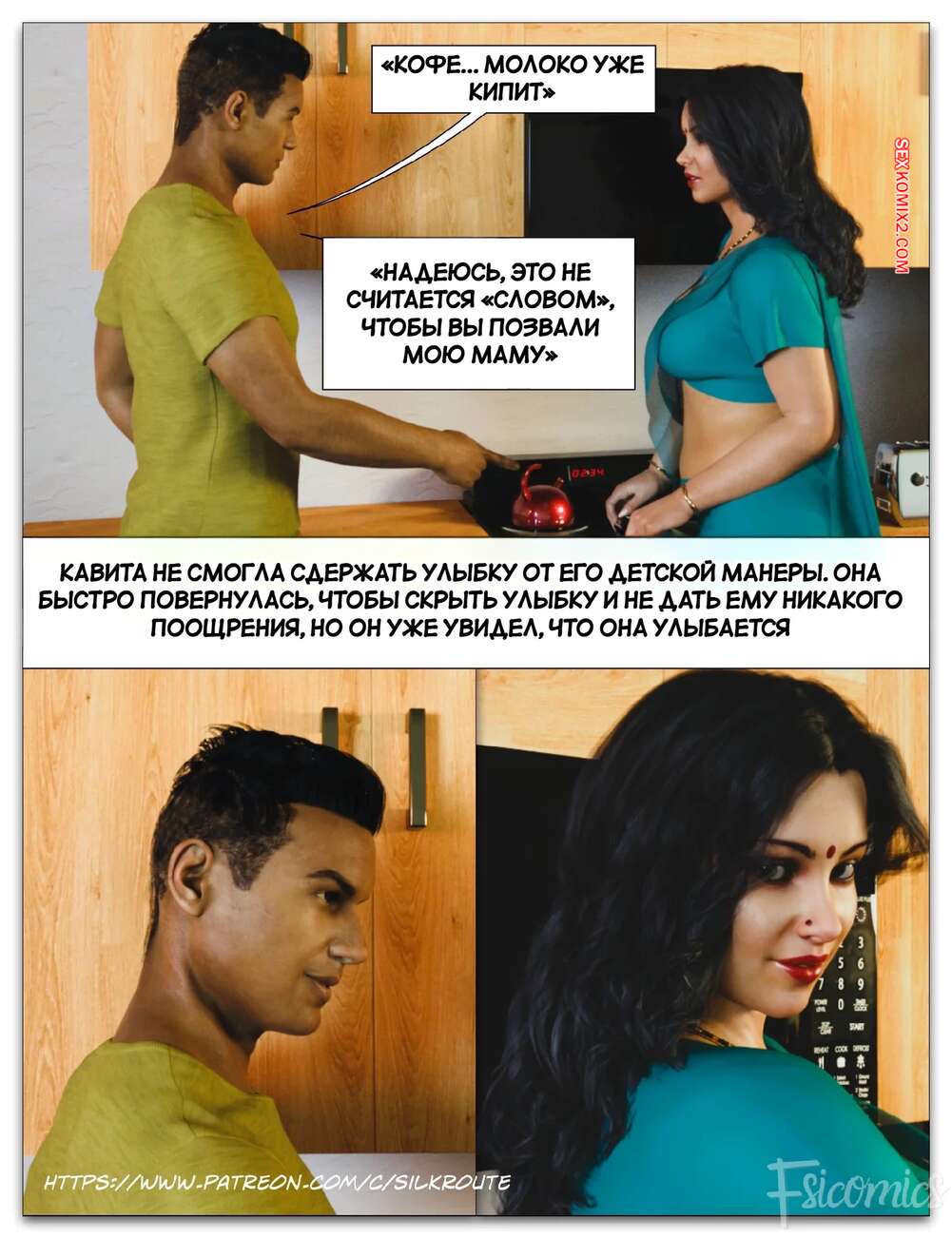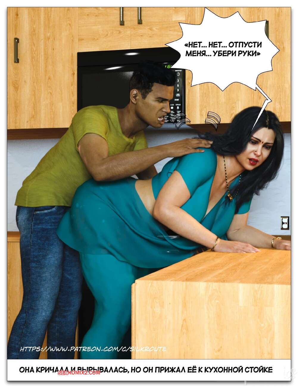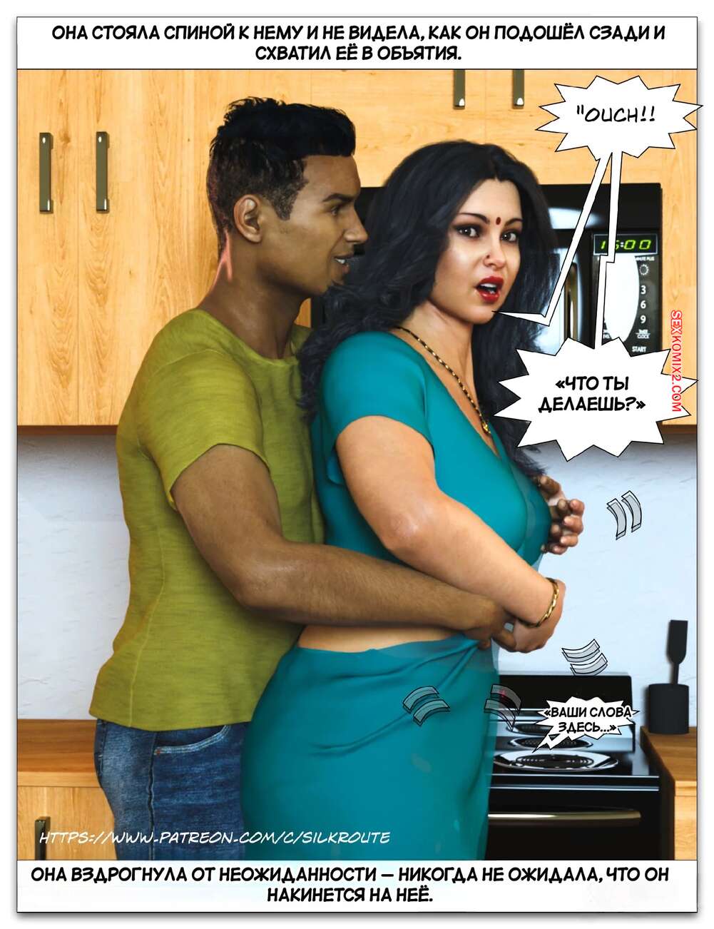 Порно комикс Забрать ее. Часть 8. Take Her. Silk Route Горячая милфа заигрывает с парнем на кухне и он быстро возбуждается. Он поставил сучку раком и стала тереться о нее твердым членом, после чего они решили отправиться в спальню.