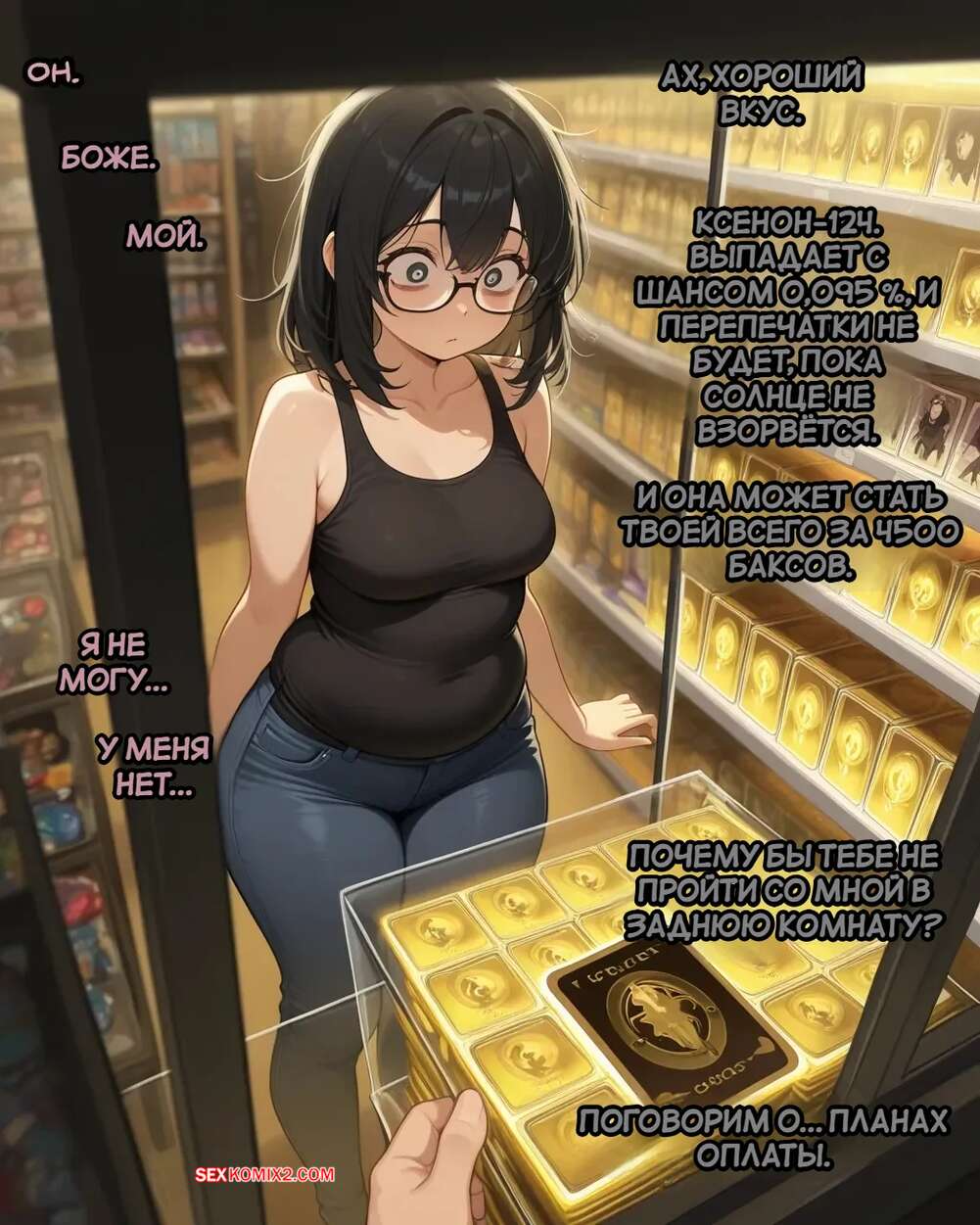 Порно комикс Магазин карт. Card Shop. BrokenBismuth. Горячая брюнетка хочет получить редкую карточку и готова на все ради этого. Она встала на колени перед парнем и взяла в ротик его член, после чего раздвинула ножки и дала себя выебать.
