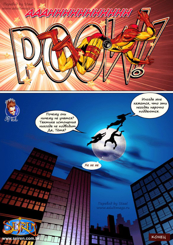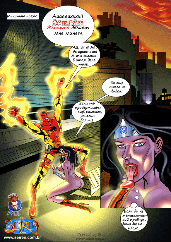 Порно комикс Супер голая женщина Шикарная голая брюнетка решила остановить горящего злодея. Она улетела с ним уединиться, после чего принялась разбираться с ним. Она стала сосать его хуй, после чего встала раком, чтобы он ее выебал и потерял концентрацию.