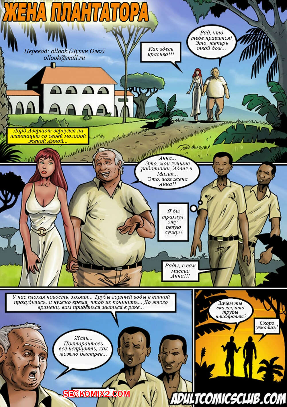 Порно комикс Жена плантатора Горячая красотка засмотрела на черных пареньков работников на ее плантации. Она не могла поверить размерам их больших хуев. Сучка решила повеселиться с ними и стала сосать их большие хуи, после чего дала им себя выебать.