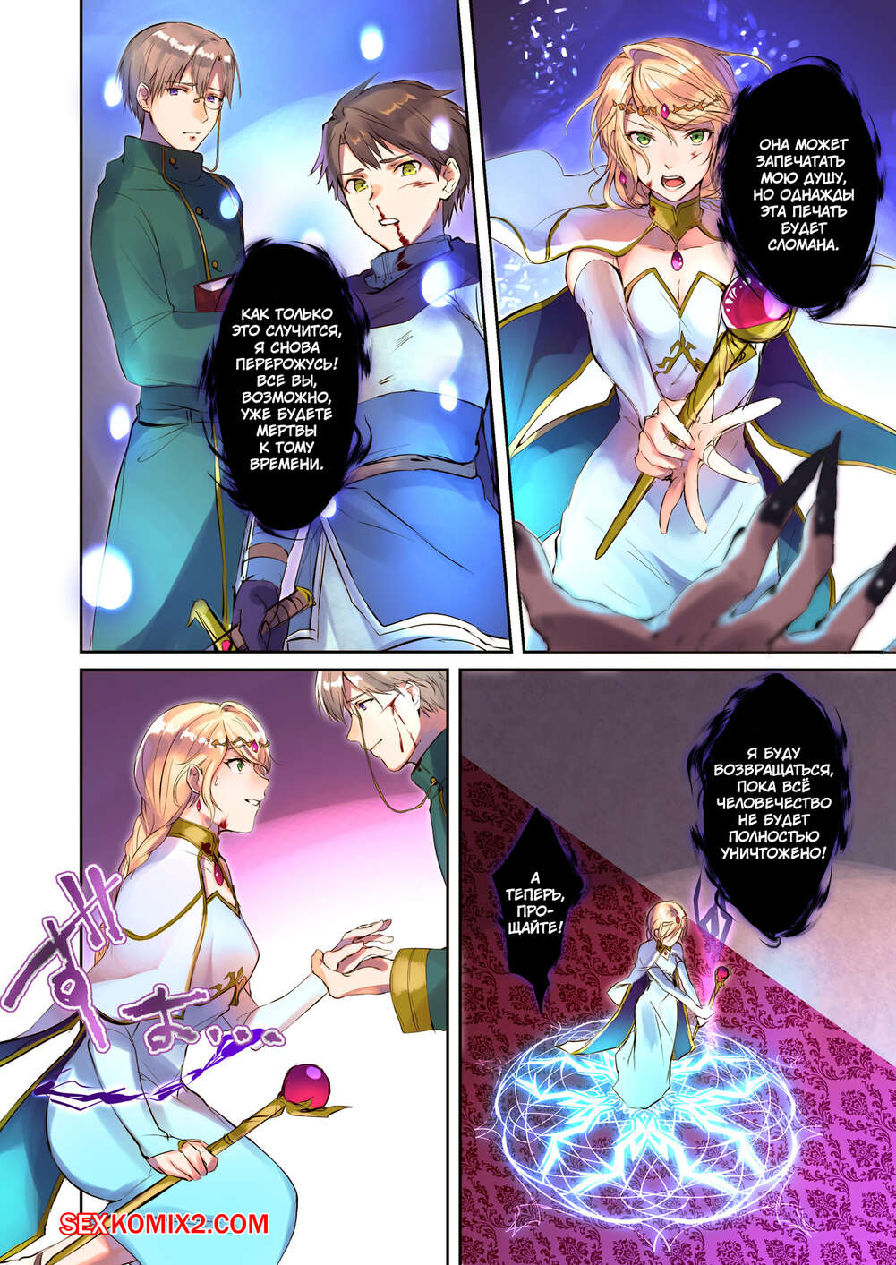 Порно комикс Как спасти короля демонов. Mahou o Kyuusai suru Houhou Горячая сисястая блондинка влюбилась в парня и стала дрочить свою пизденку, думая о нем. Парень заметил, что девушка к нему неровно дышит, поэтому решил ее раздеть и поласкать, а затем хорошенько ее выебал.