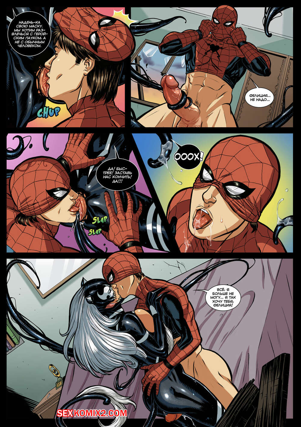 Порно комикс Веном. Сексуальный симбиоз человека паука. Часть 1 Паучок хотел поебаться со своей девушкой, но к ним ворвалась женщина кошка, одержимая веномом. Она поставила паучка на колени и дала ему отлизать свою пизденку, а затем они хорошенько поебались.