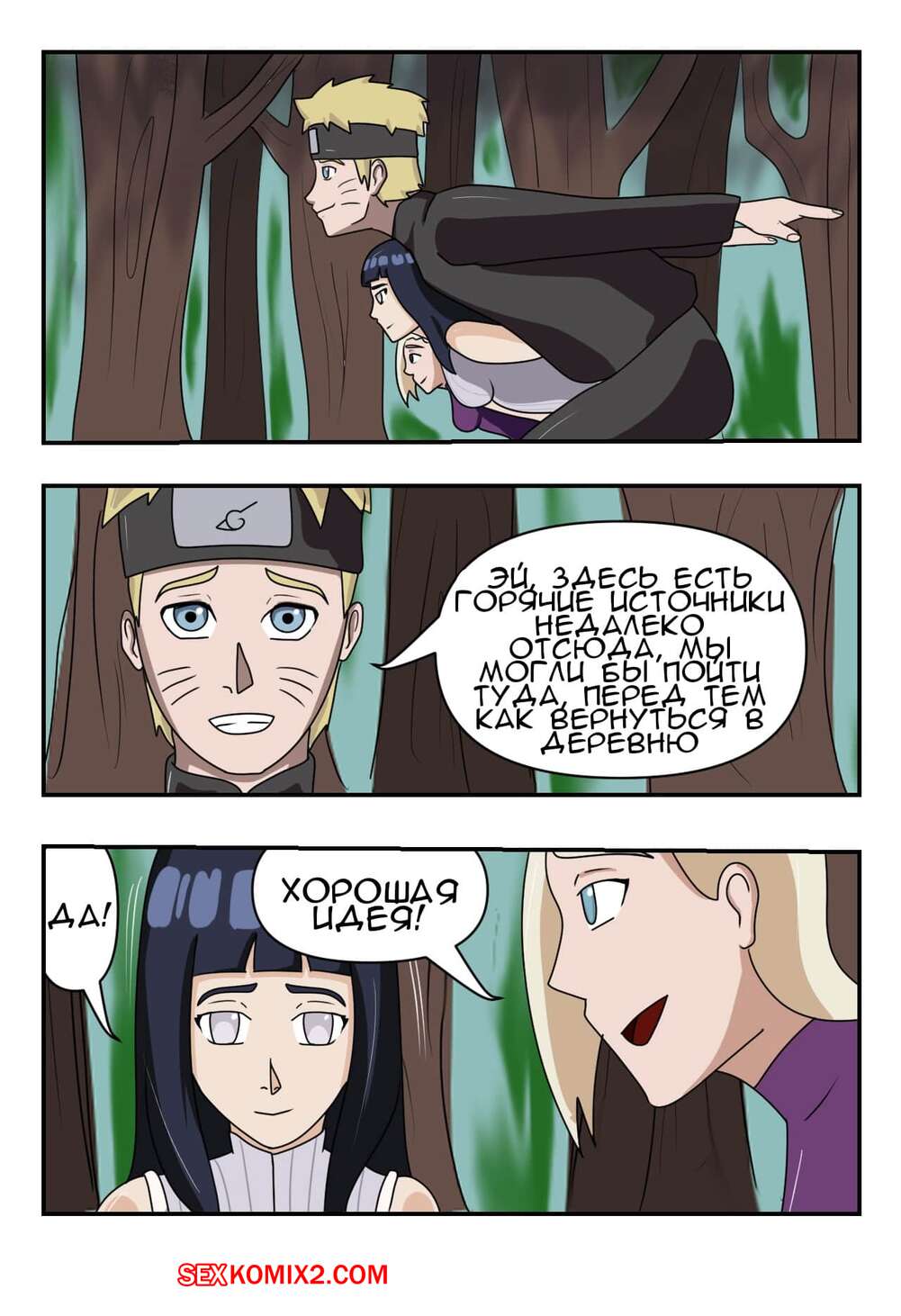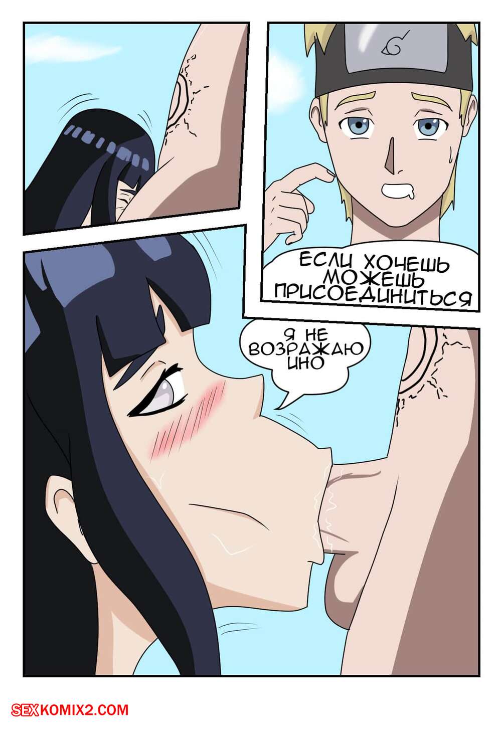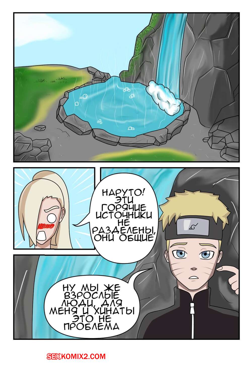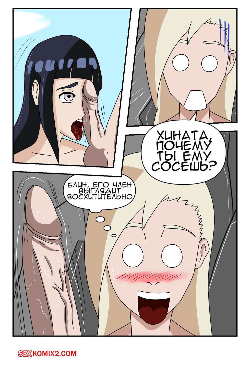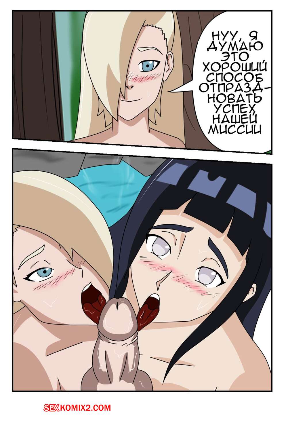 Порно комикс Наруто. Битва Шиноби. Battle Shinobi Две горячие сисястые красотки решили повеселиться со своим дружком на водном источнике. Девушки разделись и стали сосать большой хуй парня, чтобы выяснить кто из них сосет лучше.